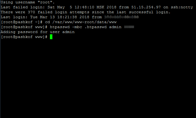 В случае если вам необходимо сменить связку логин/пароль в существующем файле пишем команду htpasswd -mb .htpasswd login password