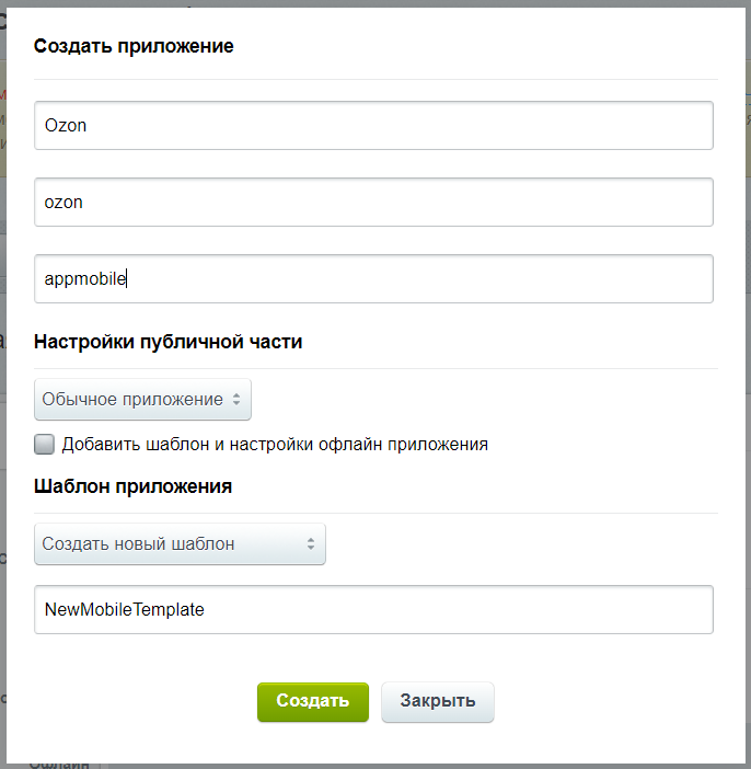 Сервисы –> Мобильное приложение –> Конструктор мобильных приложений –> Создать приложение