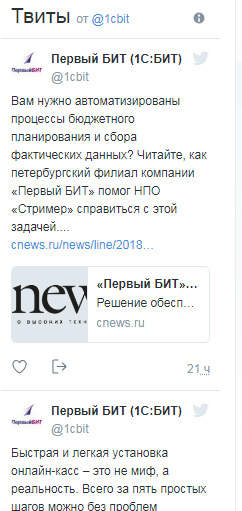 Для этого перейдем на страницу https://publish.twitter.com/ и введем @1cbit. Выберем необходимые опции и скопируем сгенерированный код. Его мы поместим в файл twitter_1cbit.php и дополним атрибутом data-tweet-limit="5", чтобы вывести 5 последних твитов