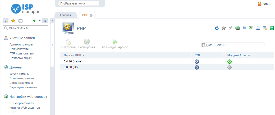 Сделал я это обновлнение собственно через панель ISPmanager версии 5.152.1 Ниже прилагаю инструкцию для самостоятельной настройки. Вариантов имеется два, использование альтернативной версии PHP и PHP как модуль Apache. Изменить на альтернативную версию php вы можете в вашей панели ISPmanager